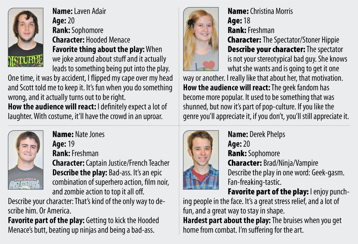 According to director, Scott Cavin, “Geek theatre is about bringing in culture and poking fun at stereotypes while using a lot of what people geek out about as a means to tell a story.” This three-act, 90-minute production was created by a New York theatre group known as the Vampire Cowboys. The Vampire Cowboys created this unique genre in which comedy is combined with a large amount of physical action.