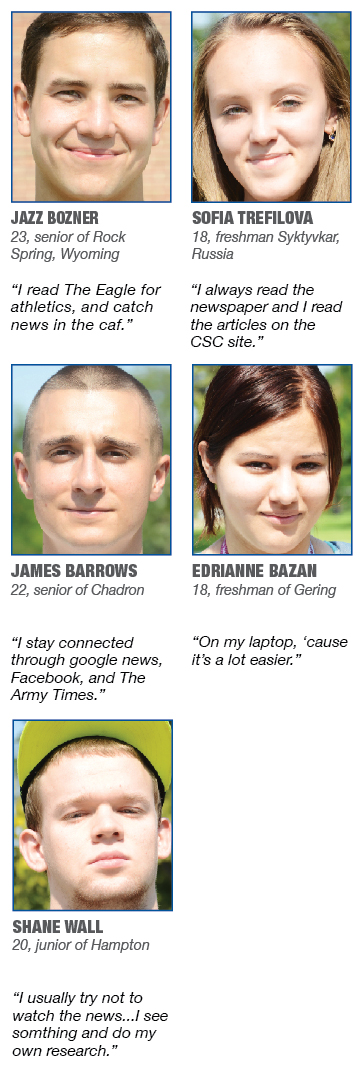 Man on the Street “How do you stay connected with news and current events?” 5:31 pm | 09/17/2014 Eagle Staff Share this:Click to print (Opens in new window)Click to email a link to a friend (Opens in new window)Click to share on Twitter (Opens in new window)Click to share on Facebook (Opens in new window)Click to share on Tumblr (Opens in new window)Like this:Like Loading...