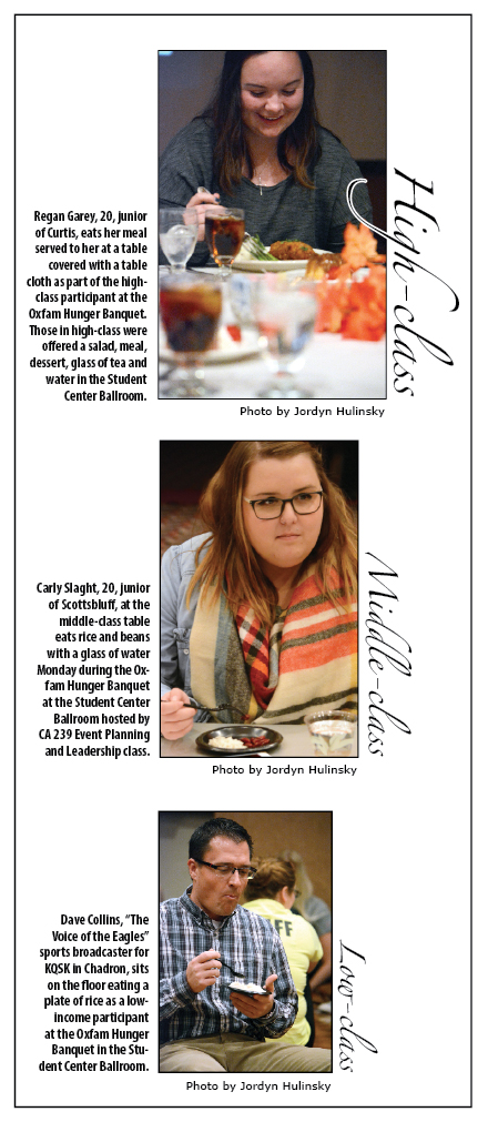 Students in CA 239 Event Planning and Leadership, in conjunction with CSC Dining Services, hosted the second annual Chadron State College Oxfam Hunger Banquet 6 p.m. Monday in the Student Center Ballroom.