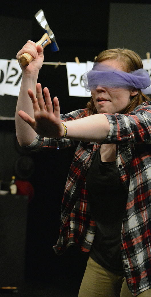 Smith, for instance, throws knives and decides she wants to throw them at a person. She slowly progresses up in the danger of objects until she comes across a hatchet, blindfolds herself, and is spun around by Wacey Gallegos, senior of Ainsworth, so she is aiming her hatchet toward the audience. Don’t worry though, no one gets hurt.